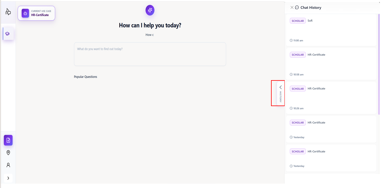 Upon Log in, there will be a chat history tab on the right side as shown below